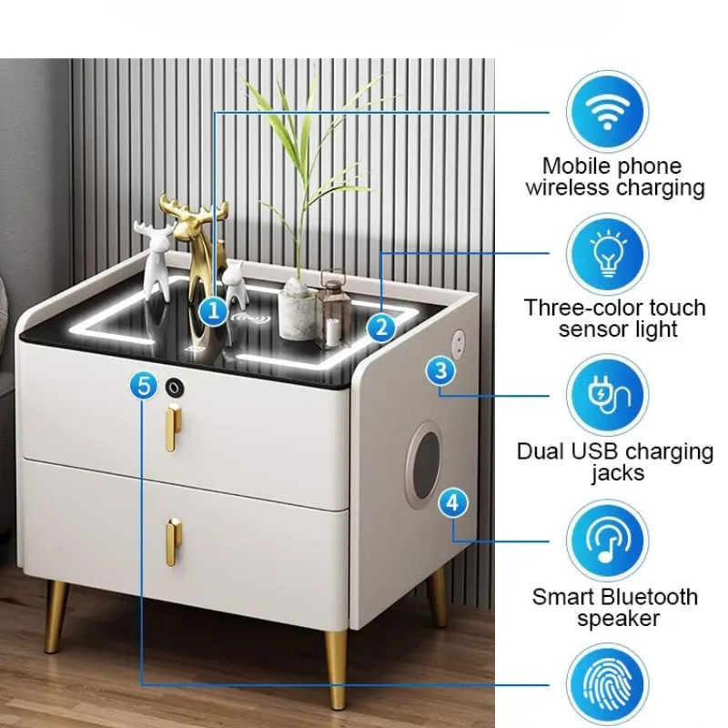 Kjo Komodinë Smart është projektuar për të përmbushur nevojat e shtëpive, hoteleve, apartamenteve dhe vilave, duke kombinuar funksionalitetin me stilin modern.