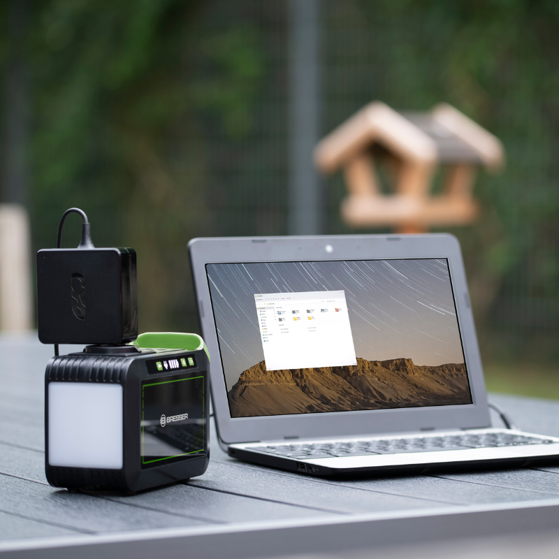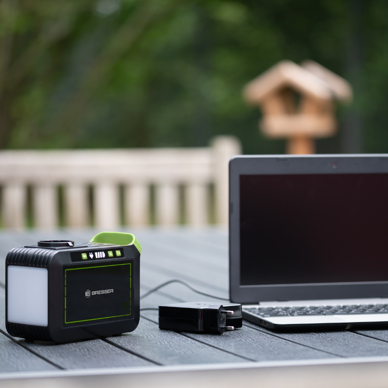 Me furnizuesin BRESSER, nuk do të keni nevojë të kërkoni një prizë kur jeni në kamping, relaks në liqen ose gjatë një ecjeje. Bateria e integruar ngarkohet plotësisht për vetëm 5 orë. Me dizajnin e tij të qetë, ofron një alternativë miqësore me mjedisin ndaj gjeneratorëve të energjisë që punojnë me karburant. Mund të shfrytëzoni gjithashtu energjinë nga dielli: në vend të përdorimit të adapterit të ofruar, mund të lidhni një ngarkues diellor opsional (nuk përfshihet) për të ngarkuar baterinë e integruar.